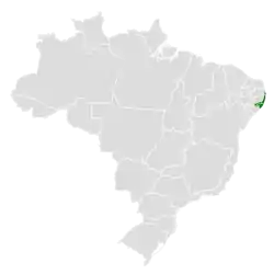 Se distribuye por el litoral e interior adyacente del noreste de Brasil, en los estados de Paraíba, Pernambuco y Alagoas.[1]