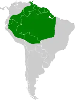 Se distribuye desde el este de Colombia, hacia el este por el sur y este y noreste de Venezuela, Trinidad, Guayana, Surinam, Guayana francesa y norte de Brasil, hacia el sur por el sur de Colombia, este de Ecuador, este de Perú, la totalidad de la Amazonia brasileña, hasta el centro de Bolivia.[1] La subespecie T. mexicana brasiliensis se encuentra aislada en el litoral este de Brasil.[6]