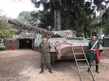 ![]() Tanque Argentino Mediano (TAM) durante un entrenamiento de escenario de guerra | ||