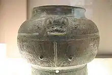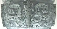 El taotie se representa a menudo como un motivo en dings, que son vasijas de bronce rituales chinos de las dinastías Shang (1766-1046 a. C.) y Zhou (1046-256 a. C.).[5] El diseño generalmente consiste en una máscara zoomorfa, descrita como frontal, simétrica bilateralmente, con un par de ojos levantados y típicamente sin área de la mandíbula inferior. Algunos argumentan que el diseño se remonta a piezas de jade encontradas en sitios neolíticos pertenecientes a la cultura Liangzhu (3310-2250 a. C.).[6] También hay una notable similitud con los fragmentos de cerámica pintada que se encuentran en los sitios de la cultura baja xiajiadiense (2200-1600 a. C.).