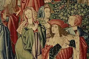 La lectura de este tapiz comienza en el extremo superior izquierdo donde la Trinidad está representada por tres personajes exactamente iguales sentados en un escaño cubierto de paño rojo como era costumbre que lo hicieran los reyes. El entorno es un jardín con una fuente en medio como símbolo de la gracia y a un lado y otro, dos mujeres que representan la Obediencia y la Libertad. La narración continúa hacia abajo con la representación de la Justicia con espada[lower-alpha 4] levantada en actitud de expulsar de su presencia a un grupo de personas identificadas con su nombre bordado: el Hombre, la Culpa, y la Debilidad.[8]