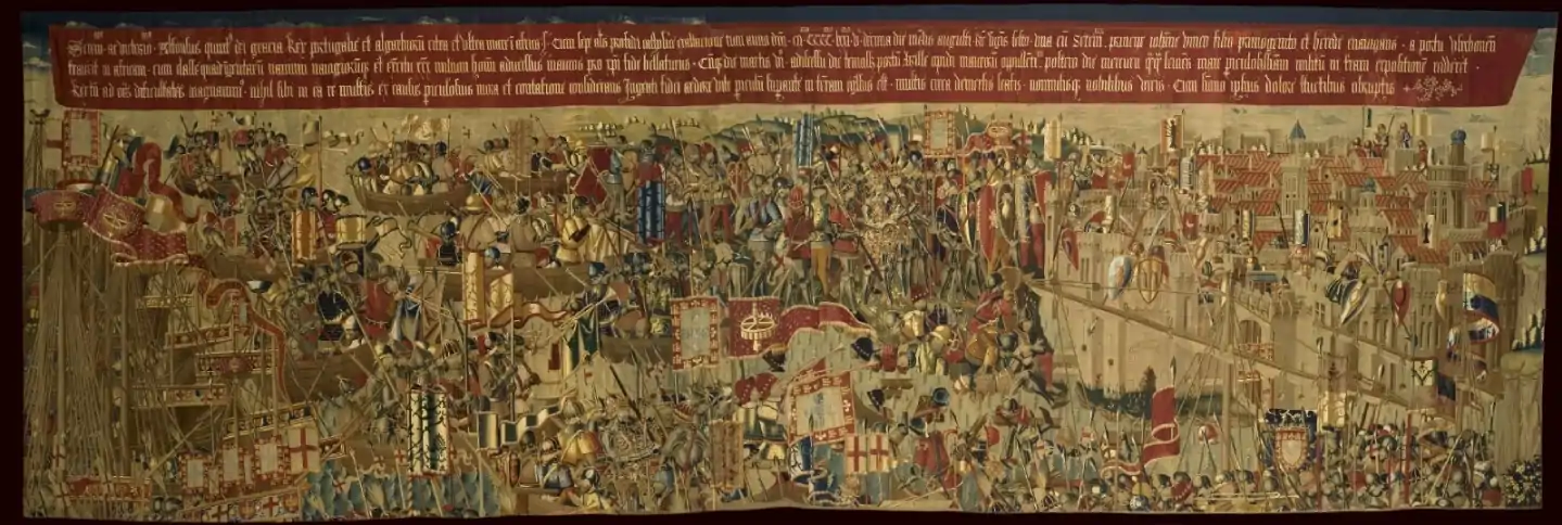 -Durante “El cerco de Arcila”, el ejército portugués asedia la ciudad durante tres días, construyen una empalizada de madera rodeando el campamento para proteger la retaguardia de posibles ataques enemigos. Dividen el ataque en dos sectores dirigidos por el rey y el príncipe a caballo, a derecha e izquierda del tapiz, respectivamente. Se describen al detalle las armas de artillería y fuego mostrando la estrategia que se empleaba en los ataques a las ciudades fortificadas.