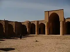 La planta principal consiste en un patio cuadrado que está rodeado por arcadas de bóvedas de cañón sostenidas por arcos de ladrillo cocido ligeramente apuntados y asentados sobre pilares circulares más bien rechonchos, típicos de la arquitectura sasánida. Los pilares tienen 3,5 metros de altura y casi 2 metros de diámetro.[2][3]