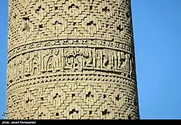 A cierta distancia de la mezquita se encuentran los restos de una columna cuadrada de fecha incierta, posiblemente del periodo de construcción original, y un alminar cilíndrico del periodo selyúcida. El alminar se construyó entre 1026 y 1029 para sustituir a un minarete más antiguo del siglo IX, y está sorprendentemente dividido en seis zonas de ornamentación, cada una de ellas revestida de ladrillo con un patrón geométrico diferente, tiene 4,2 metros de diámetro; su parte superior ha caído, pero originalmente debió de medir más de 30 metros de altura, con una galería apoyada en ménsulas de mocárabes.[4][5][6]