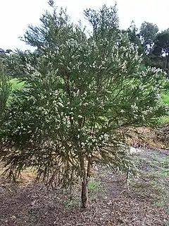 T. juniperina se desarrolla mayormente como un árbol erecto o arbusto que usualmente crece menos de 10 metros como un denso arbusto pero puede crecer hasta 27 metros en su medio ambiente natural. Tiene la corteza café fibrosa que es de color rojo claro en la parte de abajo. Crece como un arbusto en espacios desolados o como un árbol erecto cuando forma parte de un bosquecillo. Cuando las hojas o los tallos jóvenes son raspados sueltan un perfume especioso por el cual la planta se reconoce como miembro de la familia Myrtaceae. Está estrechamente relacionado con Leptospermum (Árbol del té).[1] El árbol tiene un follaje perennifolio con hojas muy estrechas, de 0.4-2.5 de largo y 1 mm de ancho. Las flores producidas por T. juniperina aparecen entre febrero y noviembre y están descritas como espigas blancuzcas rectas. Cada flor es blanca con algo de rosa, 5 mm de diámetro. [2]