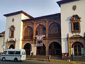 El exterior que es de estilo neobarroco presenta elementos de la arquitectura típica de Pátzcuaro, que se destaca por elementos en cantería labrada, madera tallada, y techos de teja. La fachada en su parte central presenta dos niveles de arquería, con tres arcos de medio punto elaborados en cantera en cada piso. En la parte baja se ubican tres puertas de acceso. Alternado a la arquería, se ubican torres en forma de cubo de dos niveles, que presentan puertas y ventanas con marcos de cantera tallada. Todo el inmueble luce cubierta de teja de barro.