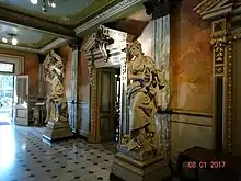 En el interior de la obra arquitectónica se puede apreciar un delicado estilo neo-renacentista con imponentes lámparas de puro cristal y columnas de mármol de Carrara.