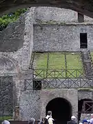 Los dos párodos cubiertos desembocaban en la zona de la orquesta. El que estaba emplazado al oeste conducía, por el otro extremo, a un gran pórtico cuadrado situado detrás del escenario, denominado el Cuadripórtico o Casa de los gladiadores, puesto que en los últimos años de la ciudad se destinó a hospedar a los gladiadores y a sus familias.[4]Desde este pórtico se podía acceder al vecino Foro triangular mediante una escalera. En la entrada al párodos se encontró una cabeza masculina de la época silana. Al párodos del este se accedía por la Via Stabiana y conducía al mismo patio porticado. Ambas galerías se construyeron en opus incertum.[7]