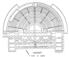 Escapan, por consiguiente, a la modulación del primer edificio algunos de los elementos porque corresponden a una ampliación del teatro bastante posterior a su creación. El anillo exterior fue añadido a la cavea para mejorar la circulación del público hacia las gradas más altas y las estancias rectangulares de los extremos este y oeste del cuerpo escénico, denominadas basílicas, tampoco se ajustan al proyecto inicial por el mismo motivo.