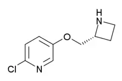 La tebaniciclina (de nombre IUPAC 5-([(2R)-azetidin- 2-il] metoxi)- 2-cloropiridina)) es un compuesto heterocíclico que actúa como agonista parcial de los receptores nicotínicos de la acetilcolina y que fue sintetizado por los laboratorios Abbott dentro del contexto de la búsqueda de analgésicos análogos a la epibatidina[2][3][4][5][6][7] pero sin el nivel de toxicidad de ésta. En comparación con ella, y pese a que la actividad analgésica es mayor dado que muestra más selectividad en su unión con los receptores neuronales del subtipo α4β2 , no superó la Fase II de su desarrollo como producto farmacéutico dado que producía serias complicaciones gastrointestinales.[8]