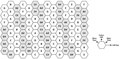 A pesar de existir un gran número de disposiciones isomórficas de notas, la tabla armónica resulta especialmente inusual por la contigüidad de ciertos intervalos musicales según la orientación en la que se desplace por los diferentes ejes del teclado que determinan los hexágonos o notas. Así se tendrá en: