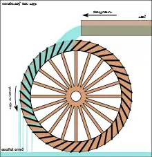 La energía del agua se aprovechaba mediante el uso de ruedas hidráulicas, que tenían dos tipos de diseños generales: aprovechando el caudal por la parte inferior o por la parte inferior. La rueda hidráulica inferior generaba energía a partir del flujo natural de un curso de agua corriente que empujaba las paletas sumergidas de la rueda. La rueda de agua de carga superior generaba energía haciendo que el agua fluyera sobre sus paletas desde arriba. Por lo general, esto se lograba construyendo un acueducto para hacer llegar el agua por encima de la rueda. Aunque es posible hacer que la rueda hidráulica superior sea un 70 por ciento más eficiente que la inferior, esta última era generalmente el modelo preferido. La razón es que el costo de construir un acueducto era demasiado alto para el leve beneficio de que la rueda hidráulica girara más rápido. Su propósito principal era generar energía para las operaciones de molienda y elevar el agua por encima de la altura natural de un sistema. También existe evidencia de que se utilizaron ruedas hidráulicas para impulsar el funcionamiento de las sierras, aunque solo quedan escasas descripciones de tales dispositivos.[3]