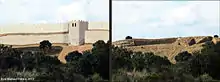 Se puede observar en la foto actual de las murallas derrumbadas que hay una especie de pelotón de piedras que sobresalen de la muralla. Los expertos aún no se ponen de acuerdo sobre su estética, es decir, tenemos muy clara su función de contrafuerte, pero no se sabe si sería simplemente otro muro adosado, o por el contrario, si podría ser una torre que comunicase con el tapial y que pudiera servir igualmente para vigilancia de soldados. '