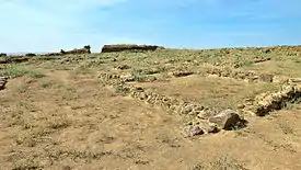 El elemento más destacable del conjunto es la muralla. Podemos datarla en el siglo VIII a. C. Su estilo constructivo recuerda a otros modelos orientales, por lo que parece indudable su ligazón con el mundo fenicio. Tiene forma trapezoidal, compuesta por dos paramentos de material calizo y relleno el interior con piedras, tierra y desechos cerámicos macizados. Posiblemente tanto la muralla pétrea como la estructura de adobe que la coronaba estuvieron enlucidas y pintadas de blanco. En la zona donde la escasa inclinación del terreno hace más necesaria su presencia llegó a tener más de cuatro metros de alto y aún hoy resulta imponente su visión.