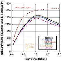 En aplicaciones reales, generalmente no se produce la combustión completa. La química dicta que la disociación y cinética cambiarán los componentes relativos del producto. Existen varios programas que permiten calcular la temperatura adiabática de llama, teniendo en cuenta la disociación a través de constantes de equilibrio (Stanjan, NASA CEA, AFTP). La siguiente figura ilustra que los efectos de la disociación tienden a disminiur la temperatura de llama. Estos resultados pueden explicarse a través del principio de Le Chatelier.
