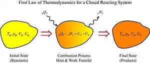 y no hay transferencia de calor debido a que el proceso está definido para ser adiabático: . Como resultado, la energía interna de los productos es igual a la energía interna de los reactivos . Debido a que se trata de un sistema cerrado, la masa de los productos y de los reactivos es constante y la primera ley se puede escribir en base másica;
