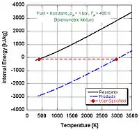 donde y son, respectivamente, el calor y el trabajo transferidos desde el sistema al entorno durante el proceso y y son, respectivamente, la energía interna de los reactivos y productos. En el caso de la temperatura adiabática de llama a volumen constante, el volumen del sistema se mantiene constante por lo que no se produce ningún trabajo;
