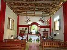 El interior es sobrio y austero, las paredes están terminadas con un aplanado rústico y pintadas de color blanco con vivos rojos, en ellas se observan a cada lado dos ventanales pequeños protegidos solo por madera rústica. En el Atrio se observa un nicho flanqueado por dos columnas adosadas a la pared y unidas por un arco. El nicho está protegido con cristal en donde se encuentra una imagen del Cristo Rey. En la parte superior se observa una pintura con dos ángeles con trompetas. También se observa un cuadro con la imagen de la Virgen de Guadalupe.
