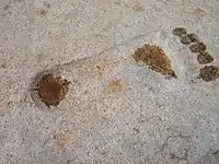 Un par de huellas grandes, de pies desnudos, cada una de aproximadamente de un metro de longitud, están talladas en el suelo de piedra del pórtico, seguido de una simple huella excavada más allá de las dos primeras y otra huella simple tallada en el umbral.[7][12][8] La huella derecha vista en el umbral, que se encuentren separada unos 10 metros de la primera huella, podría ser de humanos o dioses. Monson ha señalado que las deidades en todos los relieves del templo de Ain Dara tienen «zapatos con dedos encorvados». Por lo tanto, la fuente de las huellas, ya sea de dioses o seres humanos o animales, es debatible.[7]