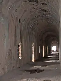 Al oeste de la terraza, una escalera daba acceso a tres salas abovedadas en el nivel inferior de la terraza. Estas salas se abren a un conjunto de corredores subterráneos que atraviesan las subestructuras, así como a un criptopórtico. La fachada sur de la terraza estaba compuesta por 12 grandes arcadas. Los pasillos interiores de la terraza, de 3,5 metros de ancho, estaban parcialmente decorados con yeso pintado. Una cavidad subterránea natural ubicada debajo de la terraza probablemente se usó para el santuario oracular, como lo demuestra el trabajo de regularización de su suelo y sus paredes en la época romana.