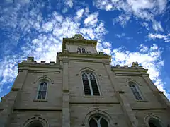 El edificio es de cinco pisos con dos escaleras de caracol gemelas, autoportantes y de eje abierto, que llevan a cada una de las dos torres octogonales del lado oeste del Templo. Las impresionantes escaleras diseñadas por el carpinterio William Asper,[9] son consideradas una maravilla en la ingeniería de los pioneros mormones, habiendo solo tres en su tipo en los Estados Unidos, dos en el templo de Manti y la tercera en el octágono de Washington DC. Otras dos se ubican en el edificio de la Corte Suprema de Estados Unidos, con la diferencia de que esas son elípticas.