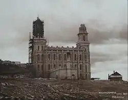 Para 1880 el primer piso del templo estaba erguido. La piedra angular estaba lista para ser colocada tres años después pero en vista de reducciones en el número de voluntarios y desafíos financieros, el tiempo previsto para su culminación se retrazó. El principla desafío para Foslom, el maestro de obras del templo, fueron las finanzas necesarias para completar el impresionante edificio y las deudas contraídas por la iglesia y los locales para la culminación de la construcción.[7]: 175 La albañilería del templo acabó en 1887, diez años después del fallecimiento de Brigham Young. La dedicación del templo se pautó para el año subsiguiente.