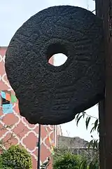 "... A la entrada del cementerio de la parroquia están tendidas en el suelo dos piedras circulares algo parecidas á la muela de molino, la una con su superficie labrada de relieve, y ambas con sus pies ó bases para fijarlas en materia sólida, tierra ó pared; tienen en su centro un agujero redondo que pasa de una superficie á otra á manera de una muela de molino, y tienen una cuarta de diámetro. La calidad de la piedra es negruzca porosa, y volcánica; tienen de circuito cuatro varas cuatro dedos, y de diámetro una vara y algo, y de canto una media vara. Es reparable la figura grabada en las dos superficies ó planos, la que tiene mas de animal que de humano, ó por mejor decir puramente ideal..." .[3]