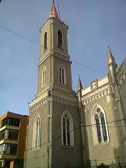Presenta una torre lateral y un capitel.