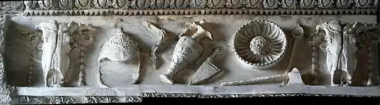 Entre los bucráneos, la serie de instrumentos y de símbolos parece repetirse según el mismo orden a todo lo largo del friso, cada serie correspondiéndose a un intercolumnio[47]·[41]. Por la izquierda, figura en primer lugar el apex, llamado también albogalerus o galerus. Se trata de un sombrero que llevaban los Flamines, símbolo de su sacerdocio, único símbolo sacerdotal en el friso del templo. Le sigue el aspergillum, utensilio utilizado para asperjar la víctima del sacrificio con aqua lustralis durante la ceremonia de lustratio. Está dotado de un asa en forma de pata de bovino[48]. A su derecha está representado el urceus, un tipo bien definido de jarra sacrificial con un asa, destinada a contener el vino. Está representada en los relieves del adorno de los altares en las escenas de sacrificios en relación con la patera. El cuerpo de la jarra a menudo tiene figuras decorativas como motivos vegetales. Sobre el friso del templo, estas figuras son más complejas y originales con la representación de animales exóticos[49]. Bajo la jarra se coloca un culter, un tipo de cuchillo utilizado durante los sacrificios sangrantes de animales. Tenía una amplia hoja triangular de un solo filo con un asa estrecha decorada sobre el friso de una cabeza de león. En lo alto a su derecha figura una patera com omphalos decorada en su cara interior, que recuerda el aspecto de un fruto abierto visto desde abajo. El omphalos central está adornado con una cabeza de Medusa o de Zeus Amón[48]. En fin, sobre la patera y a su derecha, son visibles la securis y el malleus, un hacha y un martillo de un tipo particular utilizados para matar a la víctima[48].