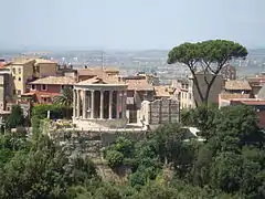 Las ruinas del templo de Vesta, que se encuentra en la acrópolis tiburtina a pocos metros del templo de la Sibila, con vistas a las cascadas del Aniene, que ahora son parte de la villa Gregoriana. Es una rotonda períptera de 14,5 m de diámetro, que rodea la cella circular de una puerta y dos ventanas, elevada sobre un podio de ladrillo de 2,4 m de altura, completamente recubierto de bloques de travertino. El deambulatorio que rodea la cella incluía dieciocho columnas de una variante del orden corintio, de las que solo quedan diez.