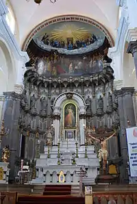 En la parte superior del altar, una hermosa pintura del padre Gonzalo Carrasco cuyo tema es "El Espíritu Santo Paráclito" muestra a las jerarquías eclesiásticas recibiendo su inspiración, representado por una paloma blanca resplandeciente. Esta pintura fue restaurada en la década de los 80´s por el artista poblano Emilio Morales Gómez.