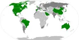 Los países que acogerán un Gran Premio esta temporada están coloreados de verde con la ubicación del circuito señalada con un punto negro; los países que han acogido alguna vez un Gran Premio están coloreados de gris oscuro.