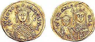 Sólido bizantino de la emperatriz Teodora II, en el reverso figuran sus hijos, el emperador Miguel III (aún niño) y la princesa Tecla.