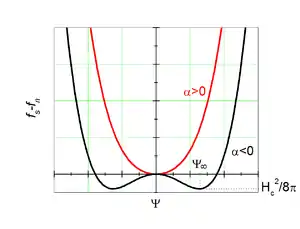 Como se puede observar en la gráfica adjunta, tomando β positivo y suponiendo que α sea negativo, habrá un rango del parámetro de orden para el cual la energía es inferior en el estado superconductor.