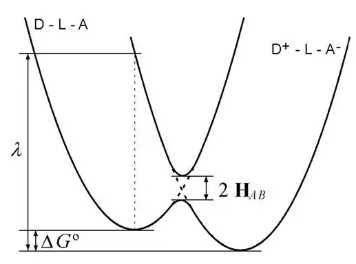 Donde es la tasa de transferencia electrónica, es el acoplamiento electrónico entre los estados inicial y final, es la energía de reorganización (tanto en la esfera interna como en la externa), y es el cambio total de la energía libre de Gibbs total para la reacción de transferencia electrónica( es la constante de Boltzmann). A continuación se presenta un diagrama de los parámetros clave: