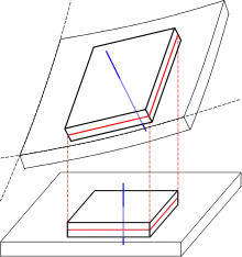 La deformación de un elemento de placa, en el que se resalta la superficie media (rojo) y la normal a la superficie (azul).