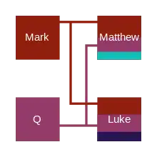 Para explicar los materiales en que coinciden Mateo y Lucas y que no se encuentran en Marcos, se postula una segunda fuente, conocida por estos dos evangelistas pero no por Marcos, que Mateo y Lucas habrían utilizado de forma independiente para completar la narración marcana. Esta fuente debería ser una colección de dichos de Jesús sin una conexión narrativa entre ellos. Johannes Weiss, en 1890, propuso denominar a esta fuente con la letra Q (de Quelle, que en alemán significa "fuente").