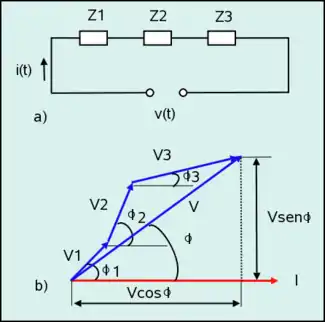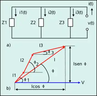 Sea el circuito paralelo y su correspondiente diagrama fasorial, figuras 2a y 2b respectivamente. Las componentes activa y rectiva de la corriente total, e , vienen dadas como suma de las componentes parciales de cada una de la corrientes que circulan por cada rama: