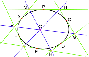 - Teorema de Pascal: "dados seis puntos en una cónica, prolónguense los lados opuestos dos a dos hasta que se corten. Entonces los tres puntos obtenidos por la intersección están situados en una misma línea recta."