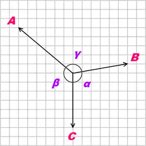 donde A, B y C son los valores numéricos de tres fuerzas coplanarias, concurrentes y no colineales, que mantienen el objeto en equilibrio estático, y α, β e γ son los ángulos directamente opuestos a las fuerzas A, B y C, respectivamente.