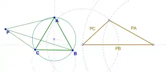 Considérese una rotación de 60° alrededor del punto B, de tal forma que la imagen de A es C y la imagen de P es P′. Entonces, , y . Por tanto, el triángulo PBP′ es equilátero y . Entonces, . Por tanto, el triángulo PCP′ tiene lados iguales a PA, PB y PC, y la demostración por construcción está completa (véase la ilustración).[1][2]