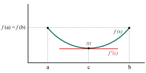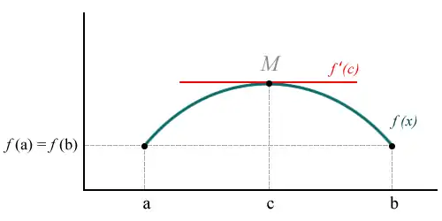 - Sea tal que . Por definición del máximo, M = f(c) ≥ f(x) para todo x de [a, b]. Entonces el cociente (f(c) - f(x)) / (c - x) es positivo cuando x < c (porque su numerador es siempre positivo y su denominador es positivo no nulo), y es negativo cuando x > c (el denominador se vuelve negativo no nulo). Pero f'(c) es por definición el límite de este cociente cuando x tiende hacia c. El límite por la izquierda, f '(c-), tiene que ser igual al límite por la derecha, f '(c+). Por lo tanto este límite común es nulo, o sea .