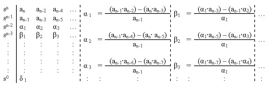 - En la segunda, toda una fila de la tabla es 0. Esta degeneración se salva montando al polinomio auxiliar de la fila inmediatamente superior a la que nos apareció la fila de ceros. A esta ecuación se le hace la derivada y lo que nos de se sustituye en la fila de ceros, pudiendo así continuar calculando. Al igual que en la anterior degeneración, para comprobar los cambios de signo se deja el 0 que nos apareció.