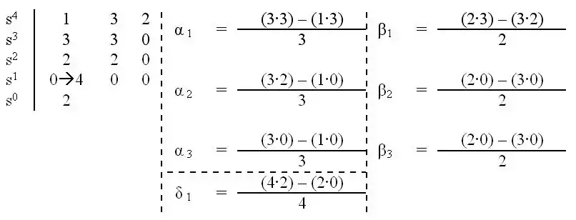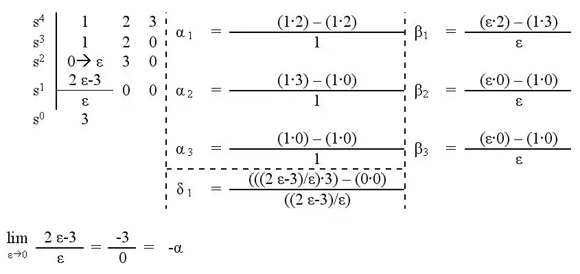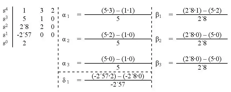 Esto nos da como resultado en la primera columna: 1, 3, 2, 0, 2, con lo que la fila 4 es una línea de ceros la cual indica una oscilación permanente, es decir en el límite de la estabilidad.