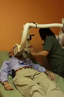 ![]() El paciente está en tratamiento de hipertermia local para cáncer de cabeza y cuello. | ||