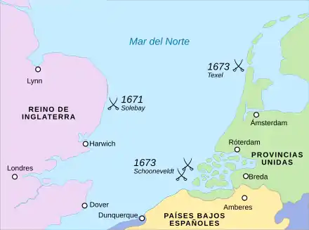 ![]() La Batalla de Texel, 11-21 de agosto de 1673, por Willem van de Velde el Joven, pintado en 1683, retrata una batalla de la Tercera Guerra anglo-neerlandesa | ||||