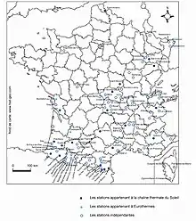 Están relacionados con áreas geológicas y geográficas. El Macizo Central produce aguas bicarbonatadas; la zona axial de los Pirineos, con aguas sulfuradas de sodio; las tierras sedimentarias del norte de los Pirineos, los Alpes y los Vosgos, aguas sulfatadas y cloradas; la zona sur de la cuenca de Aquitania, aguas oligo-metálicas calientes.[32]