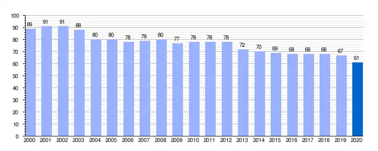 Gráfica de evolución demográfica de Terradillos de los Templarios entre 2000 y 2020 |