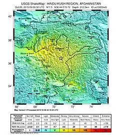 El principal terremoto ocurrió el 26 de octubre de 2015 a las 13:39 AFT (14:09 PKT, 14:39 IST, 09:09 UTC) a una profundidad de aproximadamente 212.5 km, con su epicentro aproximadamente a 82 km al sureste de Feyzabad, Afganistán. Inicialmente, el USGS midió la magnitud del terremoto en 7.7, luego lo modificó a 7.6 y luego a 7.5.[9][10] El Departamento Meteorológico de Pakistán, sin embargo, dijo que la magnitud del terremoto fue 8.1. Según el USGS, el epicentro fue a 67 km de Chitral.[11]