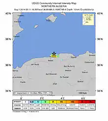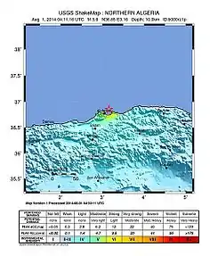 El Terremoto de Argel de 2014 fue un sismo ocurrido a las 05:11:16 hora local (04:11:16 UTC) del viernes 1 de agosto de 2014, que alcanzó una magnitud de 5.6 (MW).[1] Según el USGS, el epicentro se localizó a 15 km al Noreste de Argel, Provincia de Argel, en el Norte de Argelia. El sismo se ubicó a una profundidad de 10 km bajo la corteza terrestre. Según el Centro Sismológico Europeo Mediterráneo (EMSC), el epicentro del sismo se localizó en el mar a una profundidad de 10 kilómetros y posteriormente se registraron varias réplicas, la mayor de 4,6 grados.